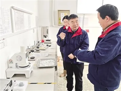 刘小宁(中)指导企业技术人员进行科研。南阳日报记者 何新红 摄